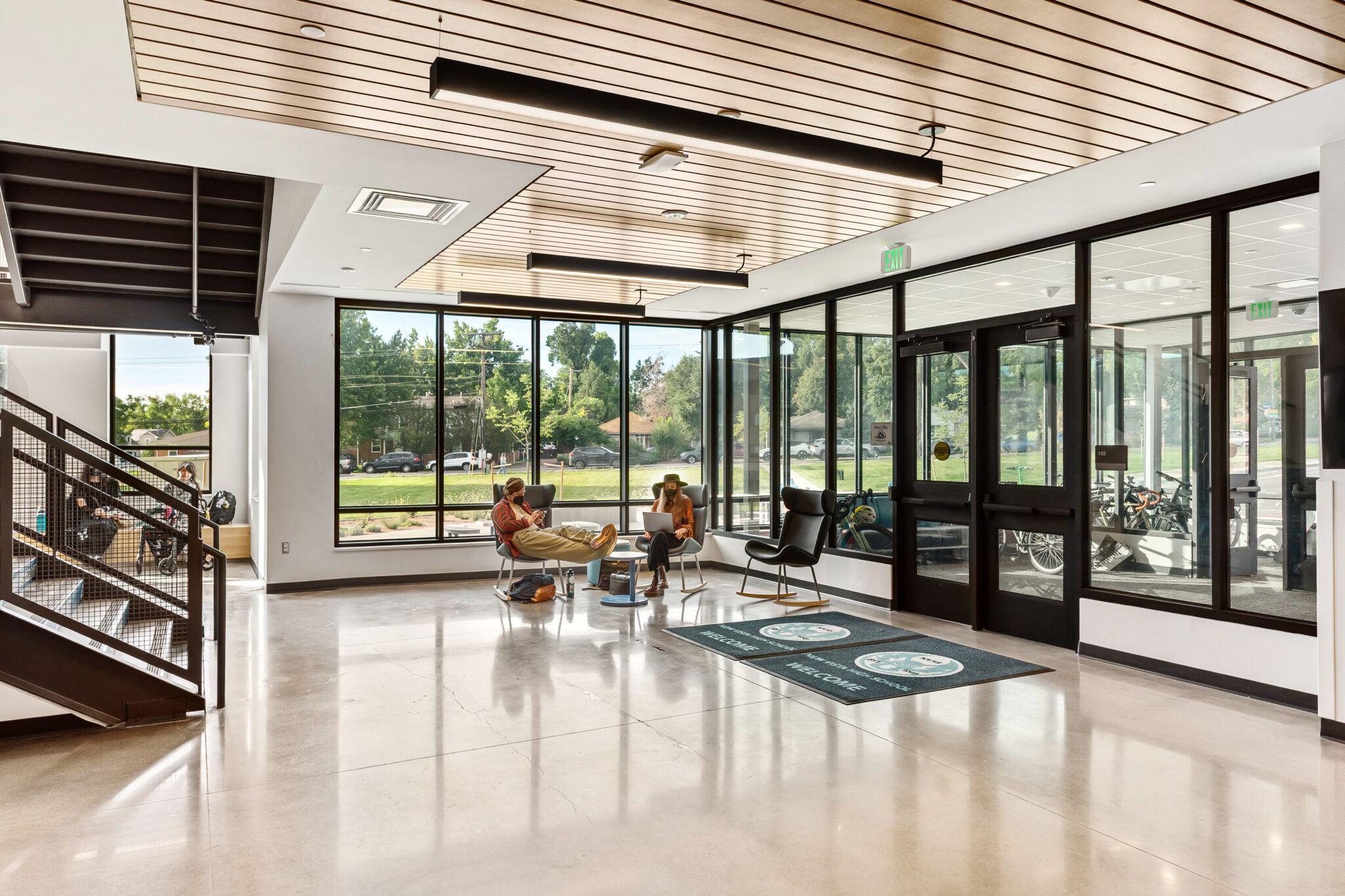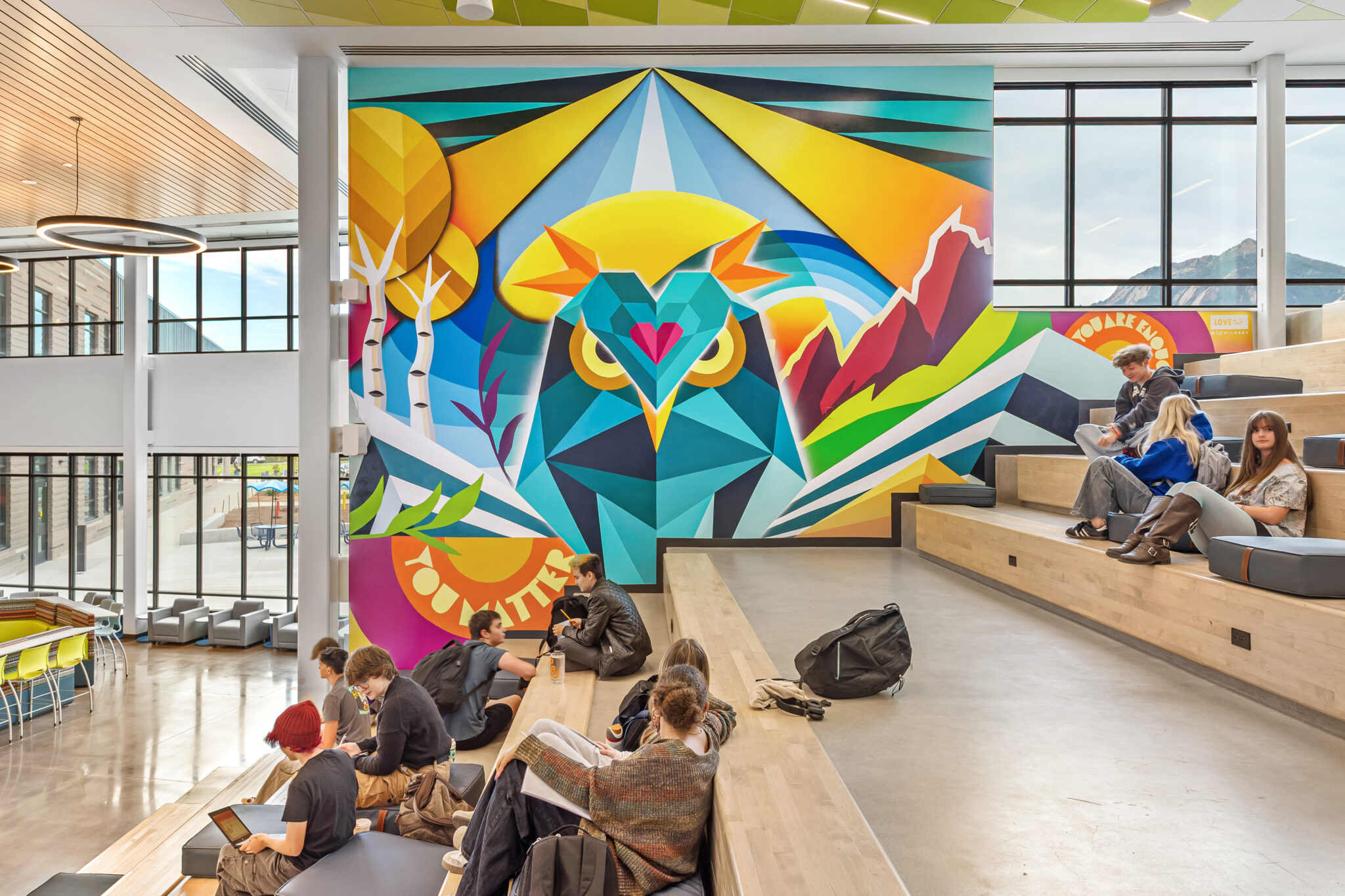 From polished concrete floors and wood ceilings to vibrant color accents and natural light, the interior material palette was selected to reflect the energy and creativity of the school community. Wall spaces throughout the building are dedicated to showcasing student work and murals created by local Colorado artists.
