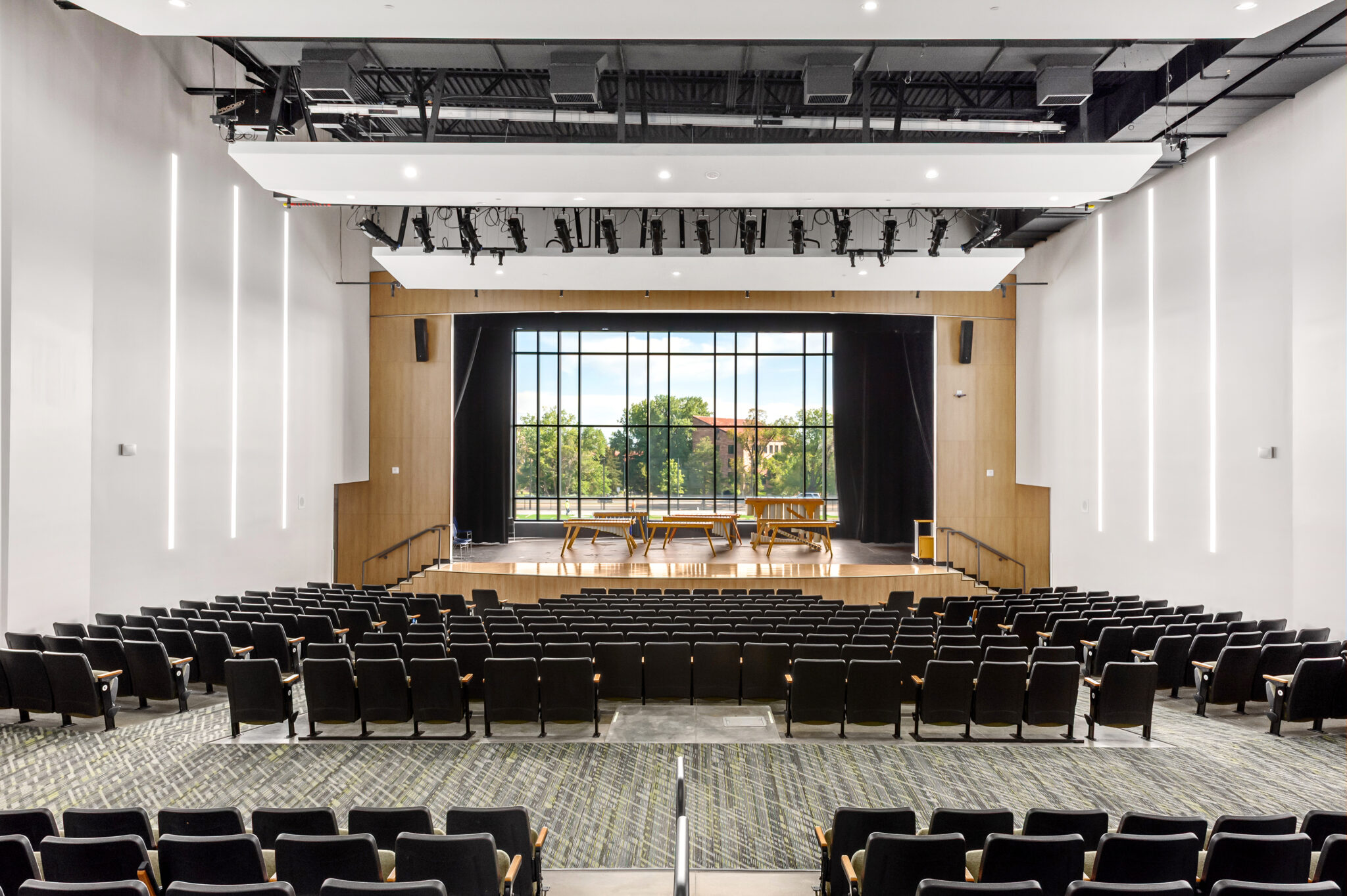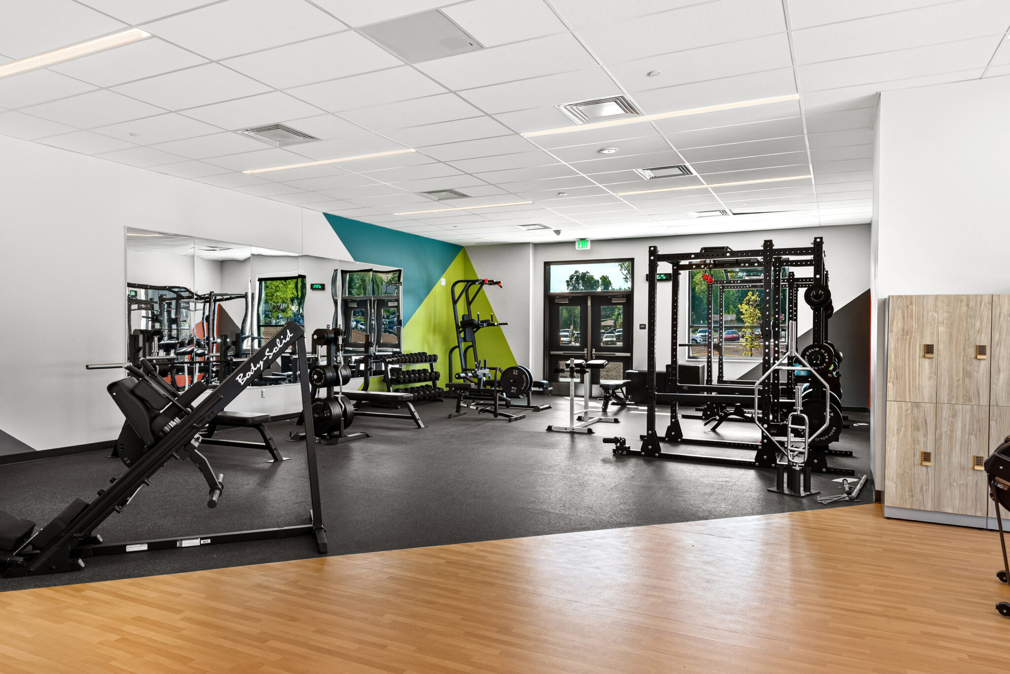 At the heart of the building is a two-story commons that serves as the school’s central hub. Surrounding this flexible, media-rich space are classrooms, breakout areas, and quiet corners that support a wide range of learning styles. Several classrooms open to balconies with expansive views of the Flatirons and CU Boulder campus, offering students fresh air and new perspectives. Instead of a traditional gymnasium or library, the school features a fitness room focused on yoga and weights, and the highly adaptable commons that doubles as a cafeteria and learning environment.
